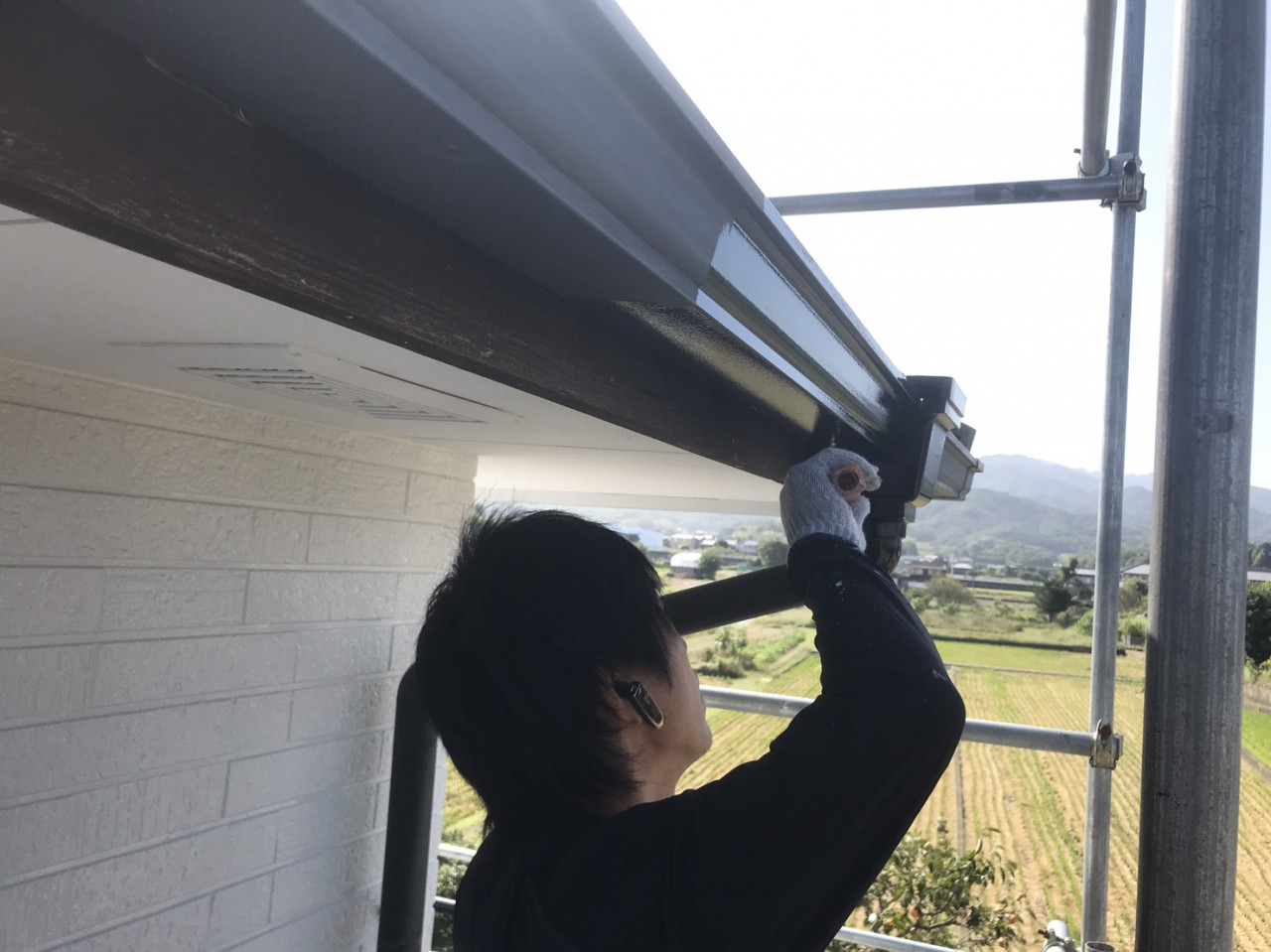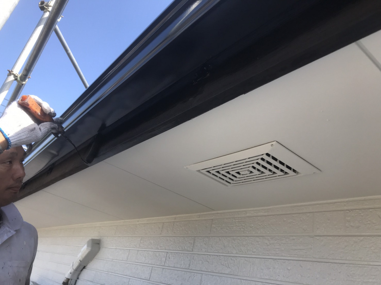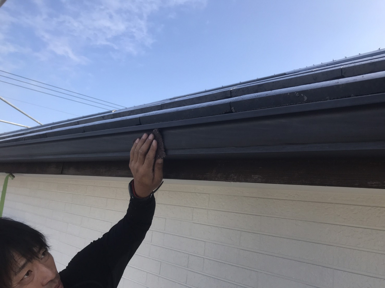 外壁塗装で評判頂いております【ユウ建装】でございます。 2019/10/14 雨樋、鼻隠しのケレンと目荒らしになります。 表面に傷を入れ塗料の密着性を高めます。 雨樋、鼻隠しの下塗りと上塗りです。サッシの色に合わせて黒で塗装致します。 ↓ 施工事例はこちらをクリック! ブログ