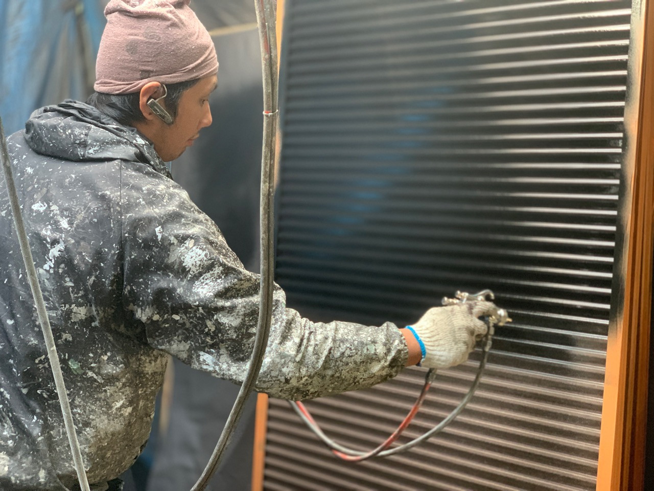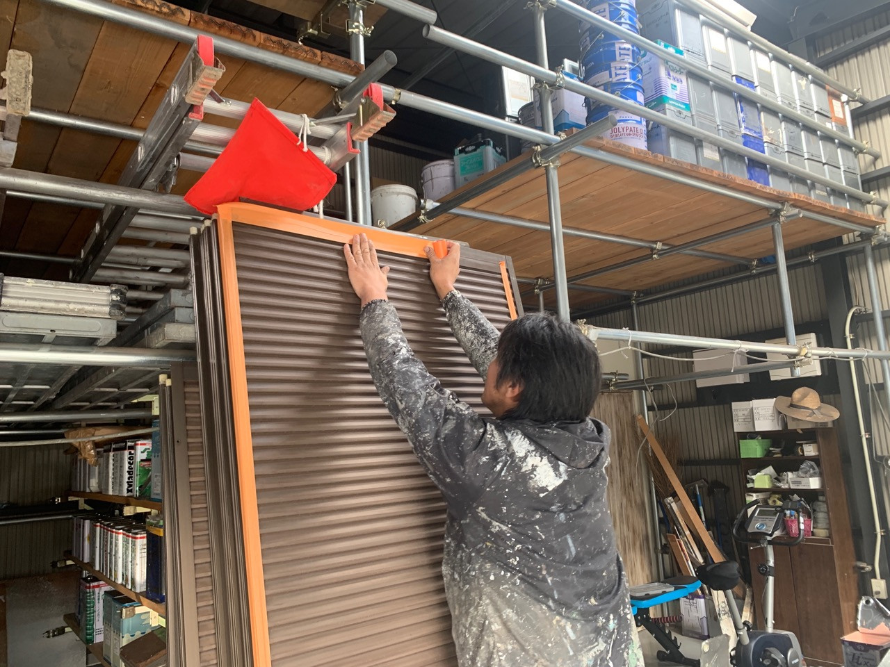 外壁の塗り替えなら香川県高松市のユウ建装へ 2019/11/28 香川県高松市十川西町の本日の作業です。 今日は雨戸の塗装をしたいと思います。お客様の雨戸や戸袋をを一旦外して工場に持って帰ります。弊社で塗装作業を行います。 雨戸の縁はアルミ製で塗装が剥がれてくるので養生をして塗料が付かないようにします。 雨戸の下塗りを行いました。表面の錆を落としてから錆止め塗装をして、錆が発生しないようにたっぷりと塗り込みます。 SK科研のマイルドサビガードを使用しています。 ブログ
