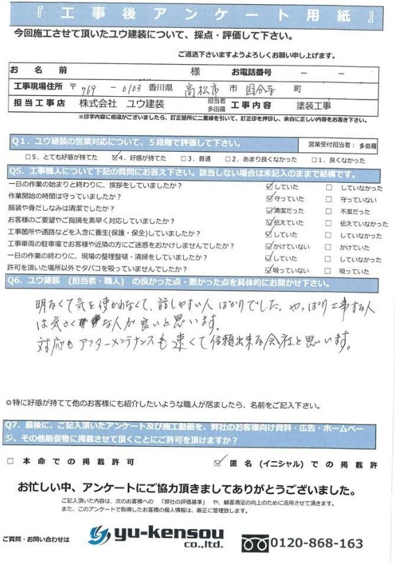 明るくて気を使わなくて、話しやすい人ばかりでした。やっぱり工事する人は気さくな人がよいと思います。