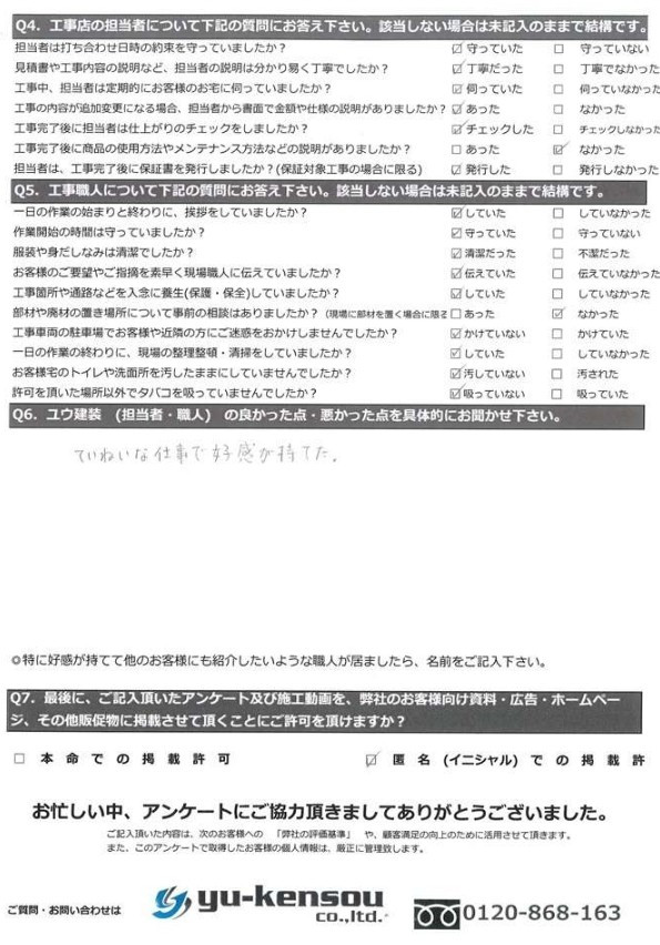 他業者を含め3社で見積もりを取った結果、ユウ建装が金額的には最も高かったが工事方法、工事期間、使用材料等について、具体的な説明があり丁寧な作業に思えたから。
