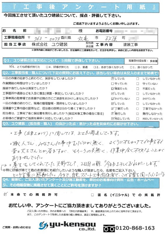 職人さん、みなさん仕事中無駄口がなく、よくラジオをかけて仕事をする昔の大工さんとが居ますがそういうのも無く、作業中全く不快なことがありませんでした。