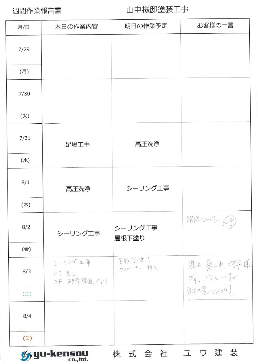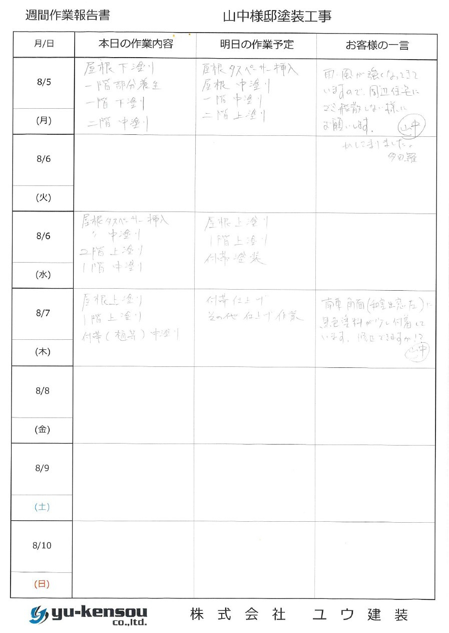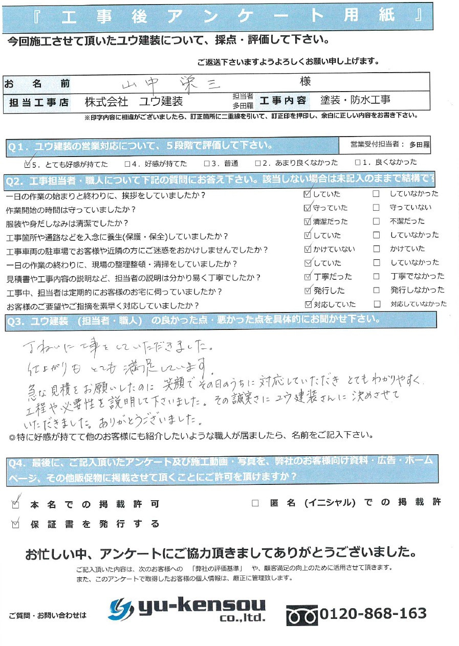 急な見積もりをお願いしたのに笑顔でその日のうちに対応して頂きとてもわかりやすく工程や必要性を説明して下さいました。その誠実さにユウ建装さんに決めさせていただきました。ありがとうございました。