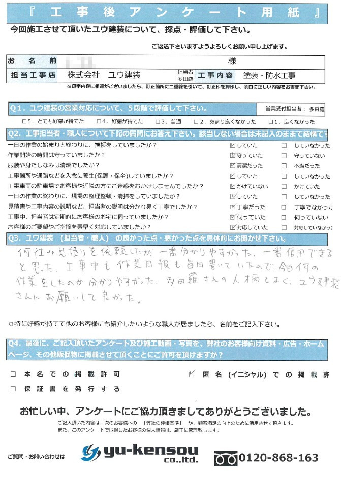 何社か見積もりを依頼したが、一番分かりやすかった、一番信用できると思った。工事中も作業日報も毎日書いていたので今日何の作業をしたのか分かりやすかった。多田羅さんの人柄もよく、ユウ建装さんにお願いして良かった。